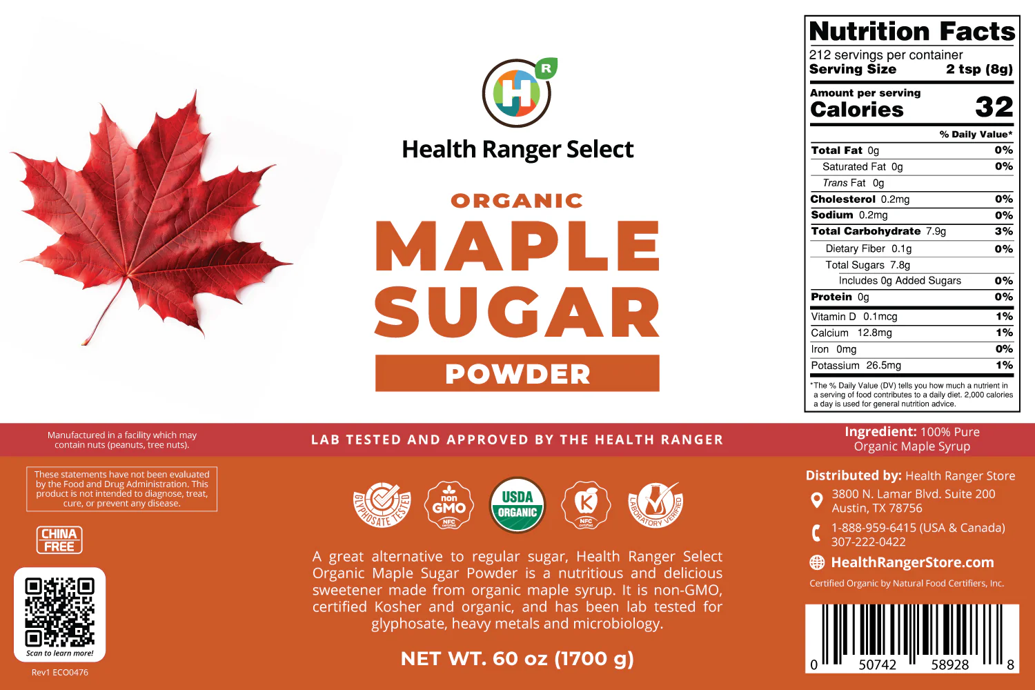 The Health Ranger Store recognizes the need for healthy alternatives to processed sugar, which is why we're thrilled to introduce our NEW Health Ranger Select Organic Maple Sugar Powder. Made from 100% pure organic maple syrup, our organic maple sugar powder is the perfect alternative to regular sugar and artificial sweeteners.