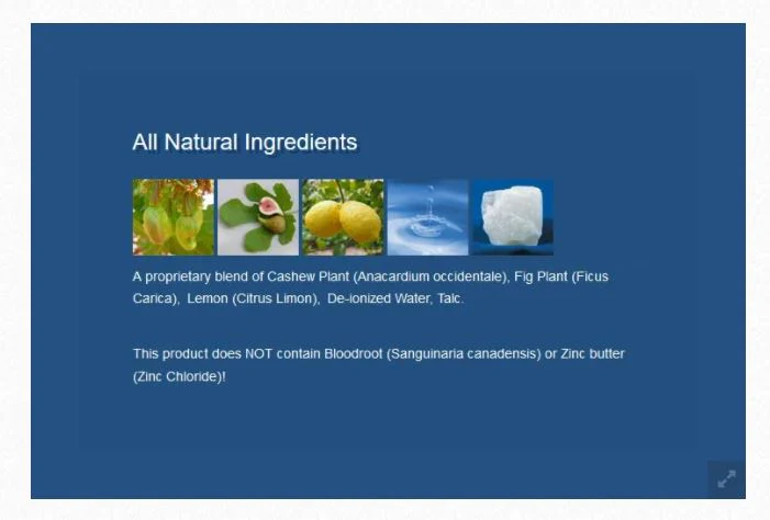 This product does NOT contain Bloodroot (Sanguinaria canadensis) or Zinc butter (Zinc Chloride)!